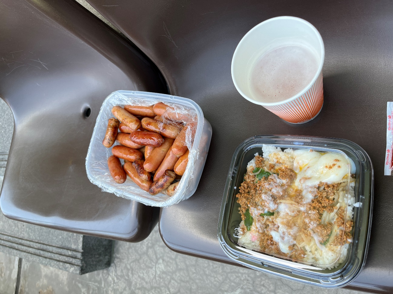 喜作のソーセージと、別のショップで坦々ライスなるものを購入しスタジアムへ入場。(ちゃっかりビールも)