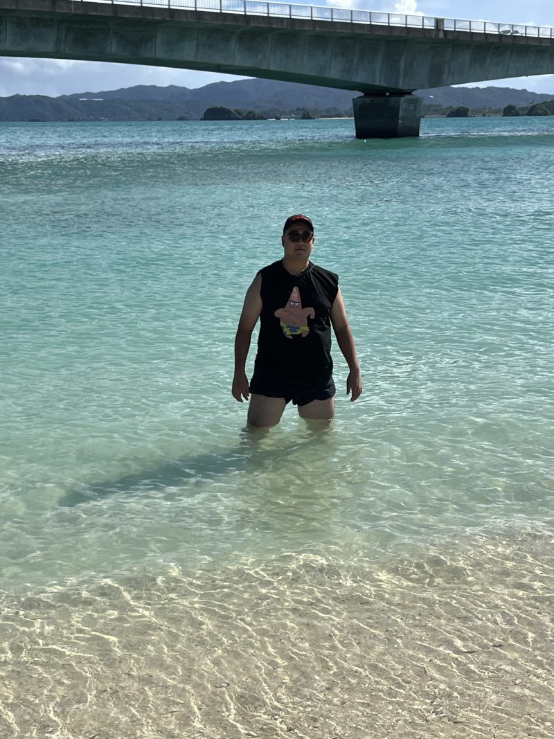 あまりの海の綺麗さに膝上まで入ってしまう営業のTakeっち。