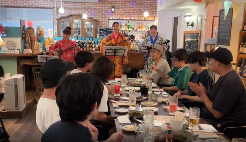 沖縄民謡はとても明るい曲調で、聞いている社員のテンションはノリノリでした( ゚▽゚)/ ハッ!ハッ!