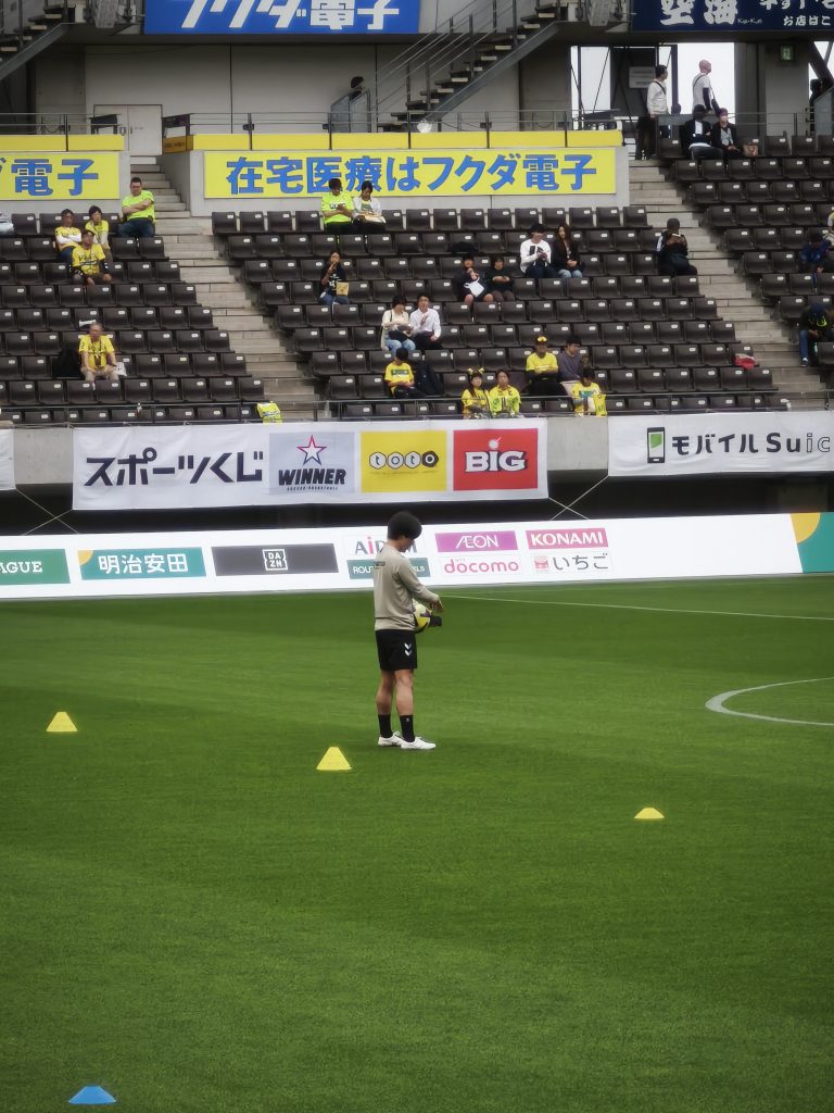 横山選手はいつも早めにピッチに入ってアップをしています。