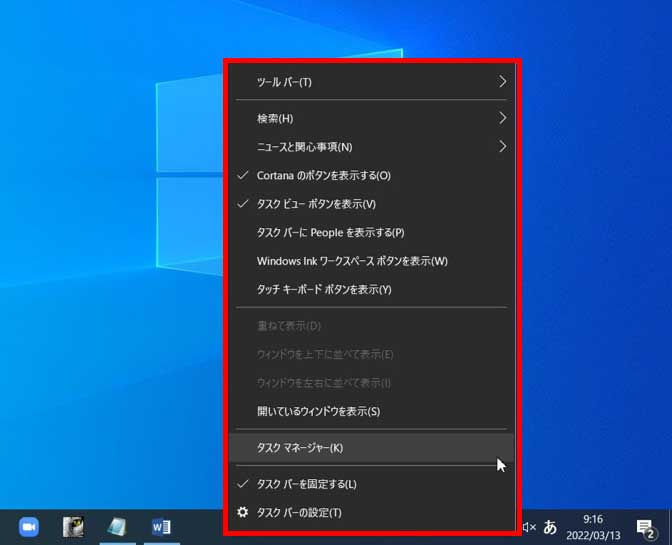 ①タスクバーの何もない部分にマウスカーソルを合わせて右クリックをします。