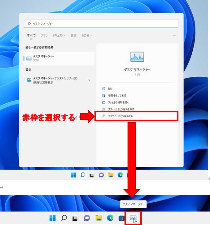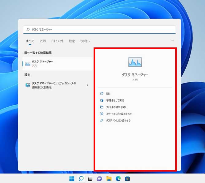 また、下記の様に検索窓から「タスクマネージャー」を表示する方法についても、同様に行うことができます。