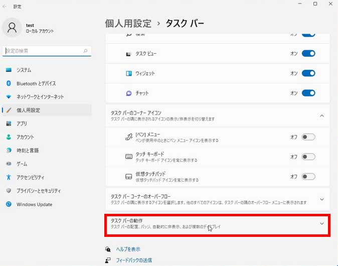 ③「個人用設定 > タスクバー」の中の「タスクバーの動作」をクリックします。