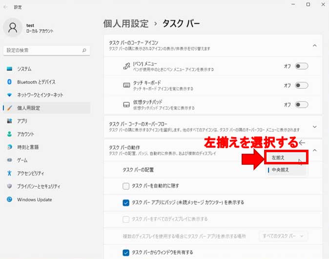 ④「タスクバーの配置」の「中央揃え」から「左揃え」に変更します。