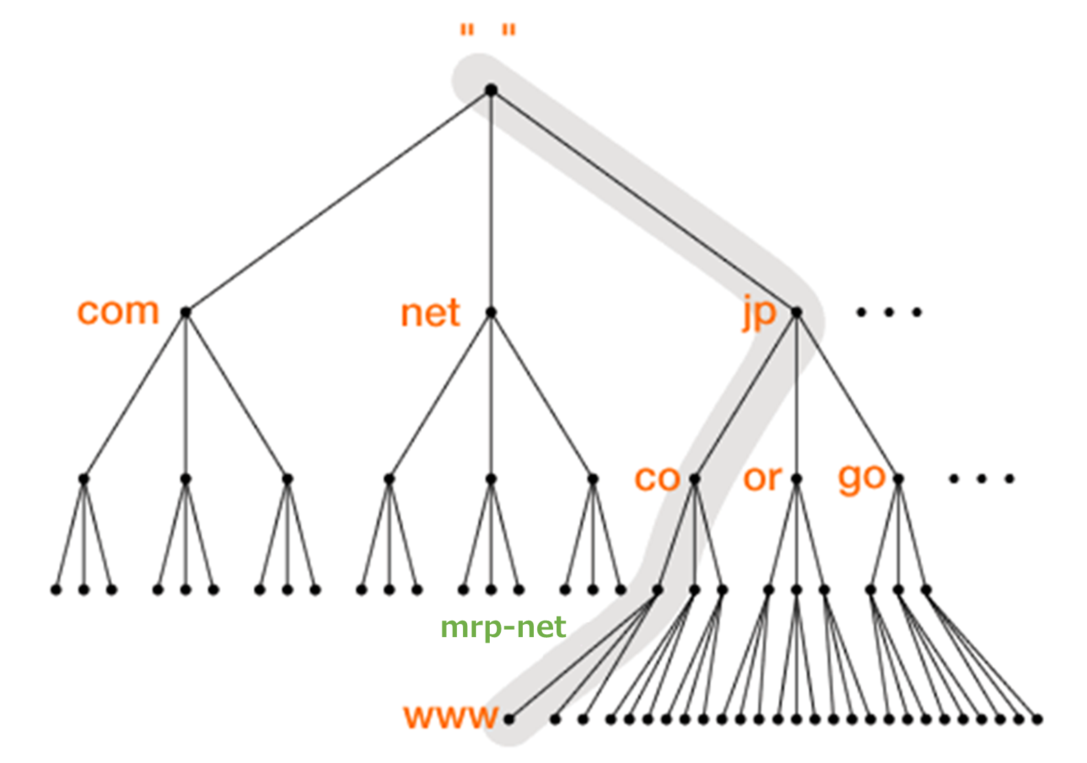 DNSでは、ドメインが以下のようにレベルごとに、ネームサーバと呼ばれるデータベース機能にて管理されています。