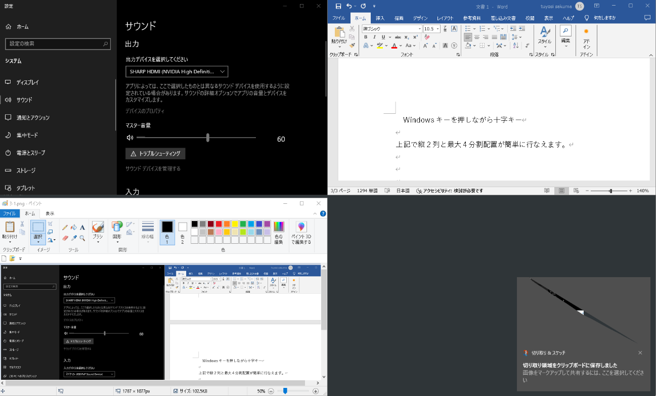 画像3  4分割 Windowsキーを押しながら←、↓、↑、→キーで配置