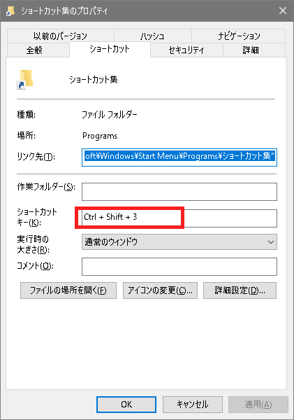 2.ショートカットのプロパティでショートカットキー(K):にショートカットのキーを押下