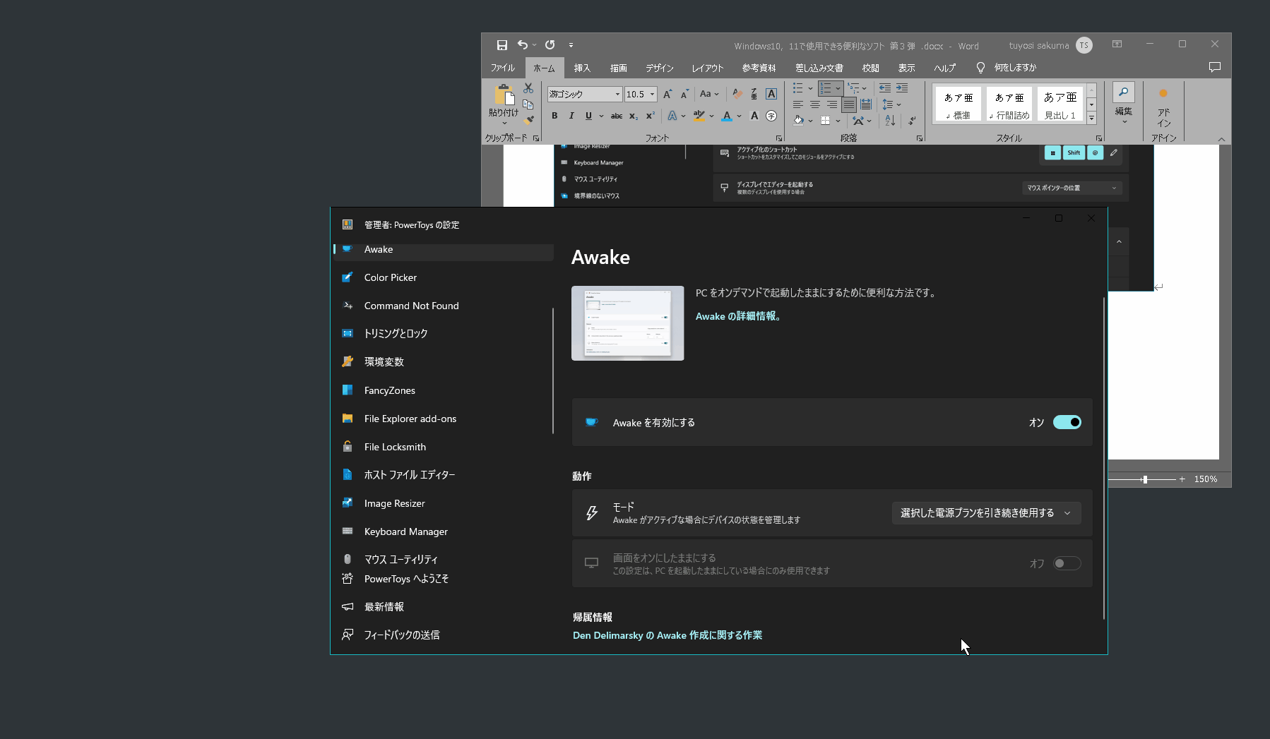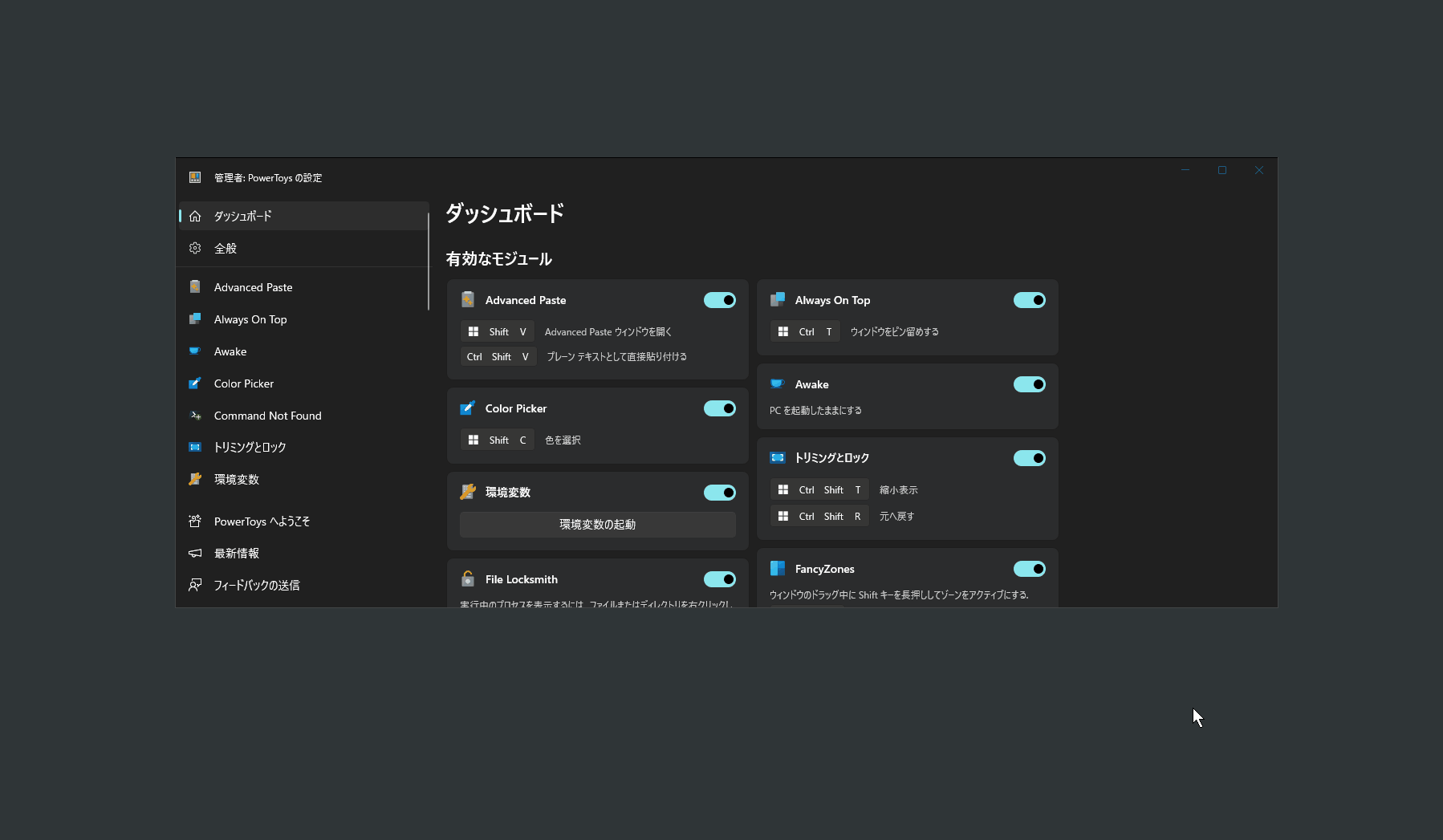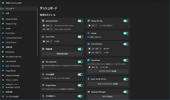 なお、動画の最初あたりに写った以下の箇所は、「Fancy Zones」の管理画面です。