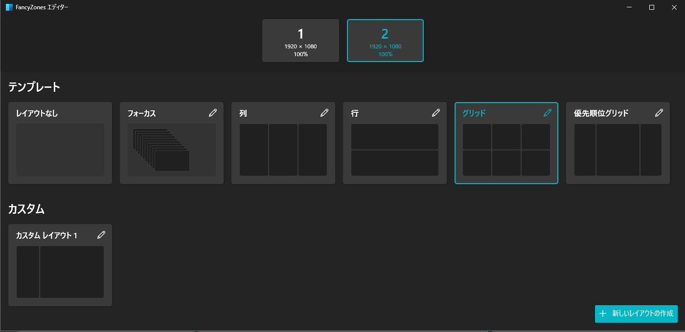 またWindowsロゴ+シフト+@キーで以下のFancy Zonesエディターが呼べます。