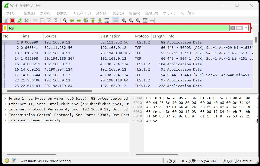③パケット量は多くフィルタなしで確認するのは大変なので、確認したい情報を見やすくするために、「tcp」でフィルタをしています。