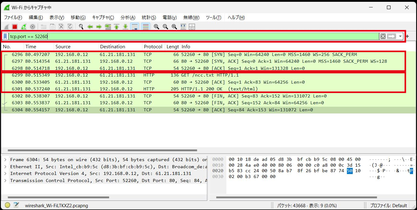 今回は、「tcp.port == 52260」でフィルタを行っています。
